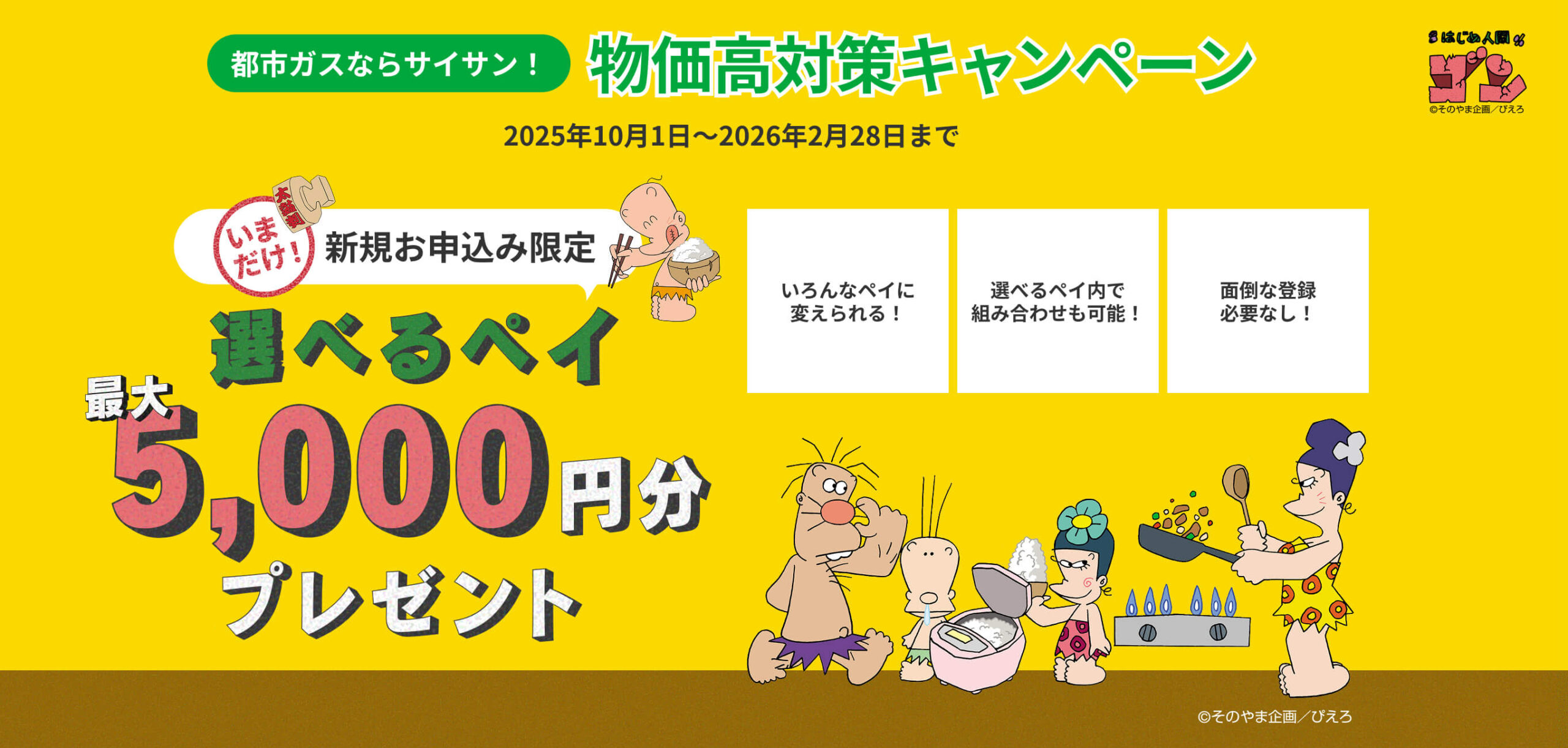ご利用開始後、5ヶ月間の都市ガス月間平均ご請求額が税込5,000円以上のお客さまへ5,000円の選べるペイ、税込3,000円~4,999円のお客さまへ3,000円の選べるペイを進呈します。