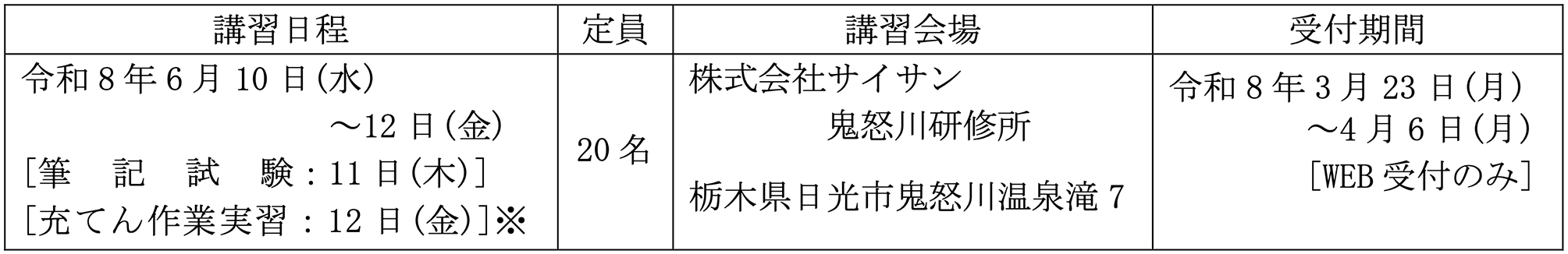 ※ 12日(金)の充てん作業実習は、11日(木)の筆記試験合格者のみ対象です。